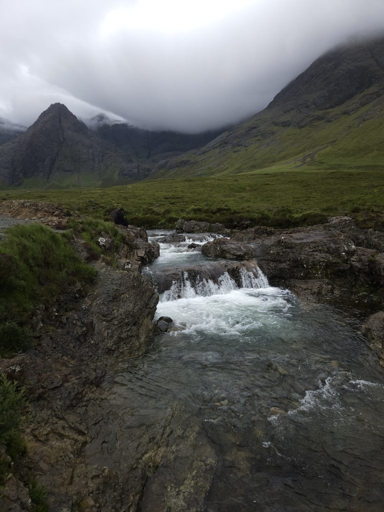 I will preface this by saying, if you aren’t a fan of waterfalls, you may want to skip this one. I, for one, am EXTREMELY fond of waterfalls. If I see 30 of them, I’m still excited to see 30 more. Something about the natural rush of water and how if flows over rocks is magical to me. Okay, now that I’ve prefaced with that, the Fairy Pools are a must see for all waterfall lovers. I will say that it’s not a short walk. It’s not particularly hard, just not short. There is a car park (parking lot for those who live in the USA) that you have to pay for at the kiosk. There are also bathrooms, which is a PLUS. If you haven’t been to Scotland, you always take advantage of bathrooms when you have access to one.