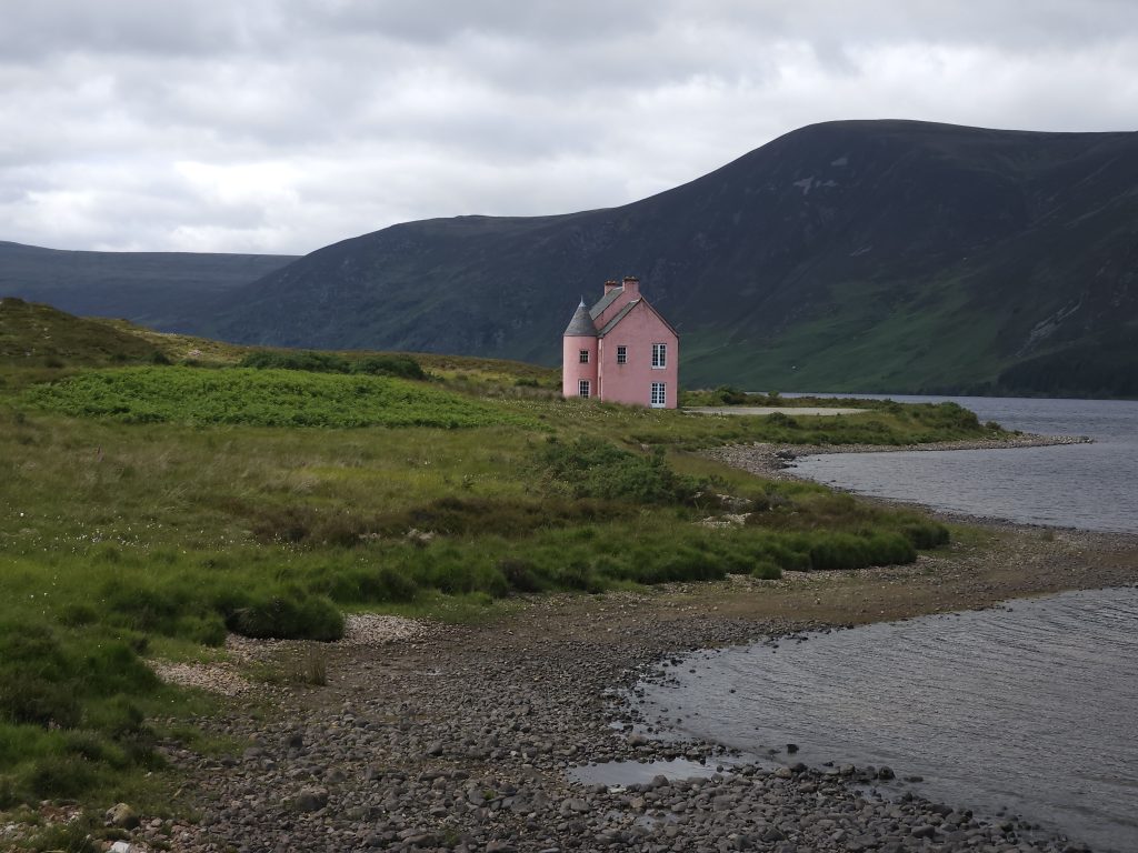 To get there, you’ll need to park at a little parking area to the right. Then, continue to walk down the road you were on and come to the beautiful Eileanach Lodge. Just go through the gate and keep walking. You’ll want to take the path to the right. Eventually you’ll get to a place that has hogs penned up to the left. By this time, you should see the Pink House in the distance.